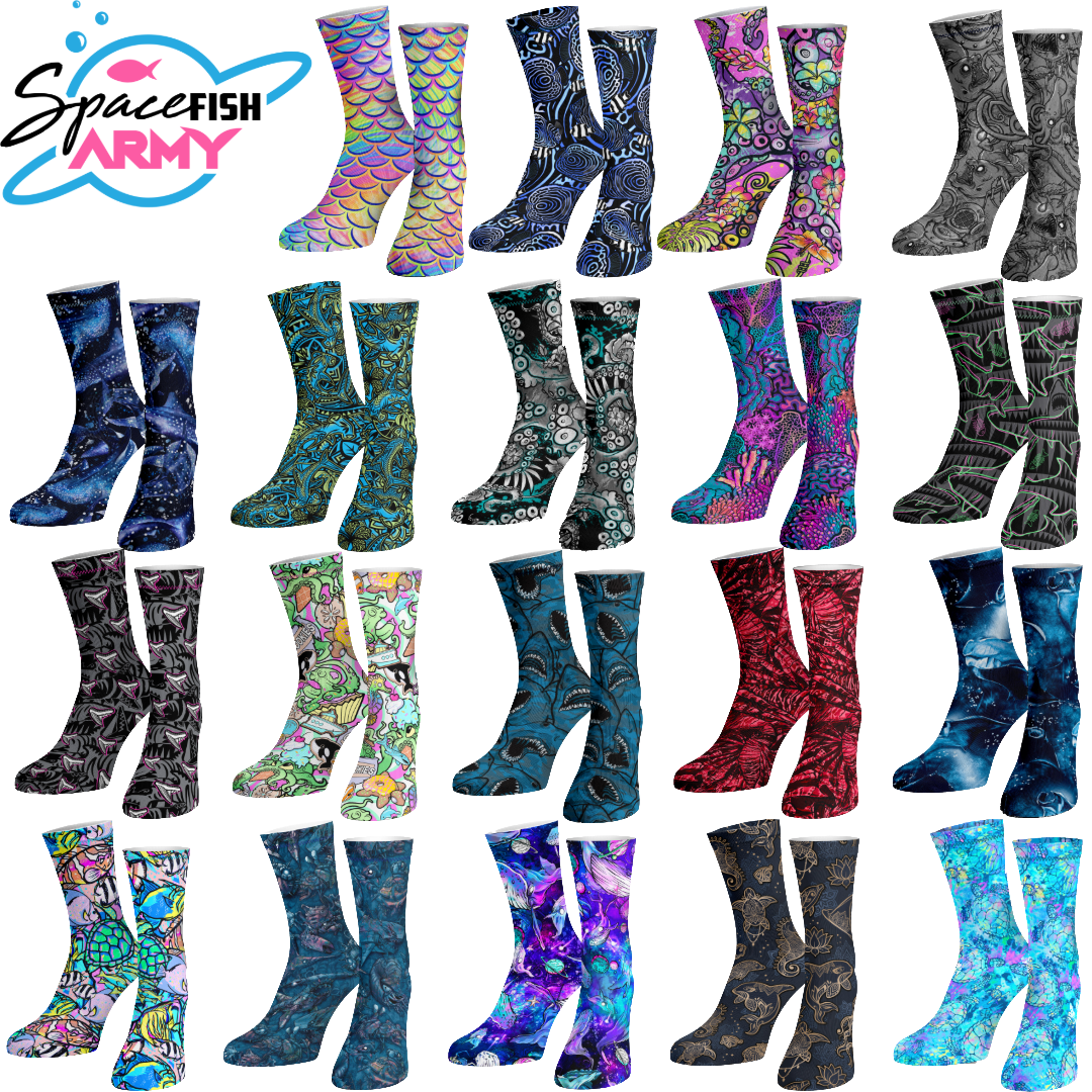 Protect against blisters and make getting in and out of your wetsuit and booties a breeze with Spacefish Army Eco-Friendly Dive Socks. Made with a quick dry poly blend and sublimation printed graphics giving you a bold, all-over design, while remaining stretchy and comfortable. Spacefish Army Eco-Friendly Dive Socks are made with Recycled Polyester made from repurposed single-use plastics that would otherwise end up in our landfills and oceans.